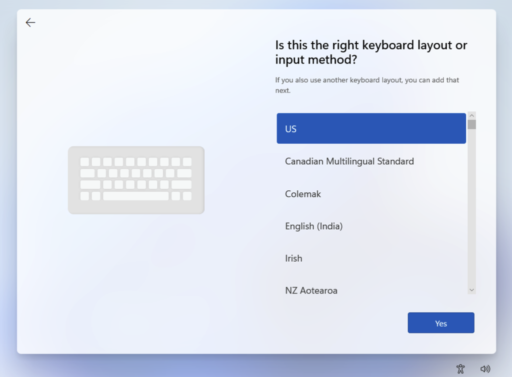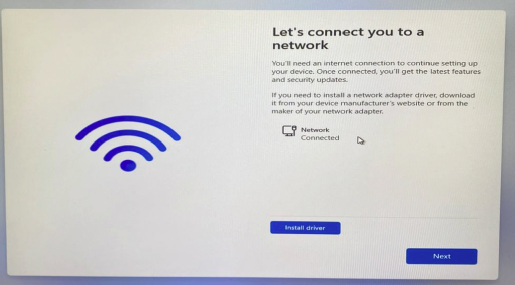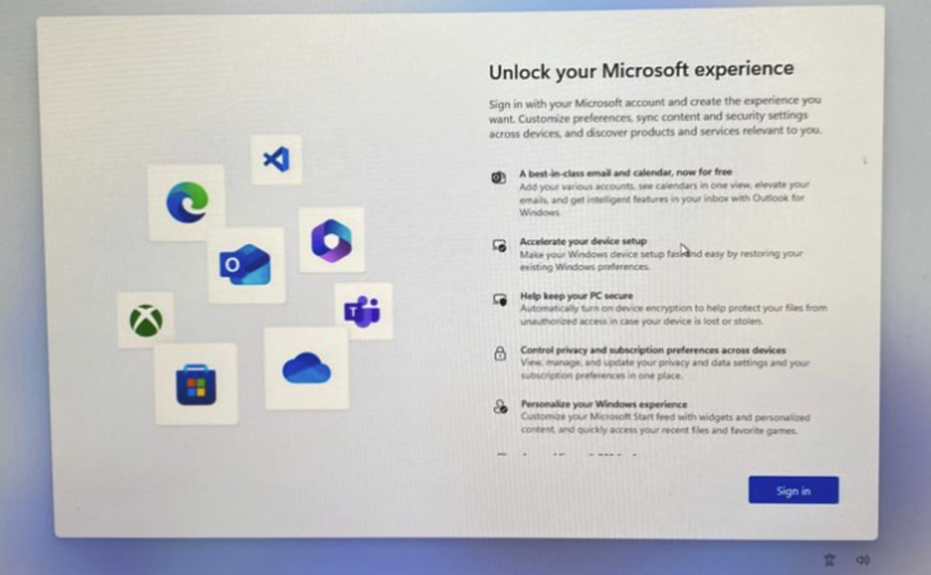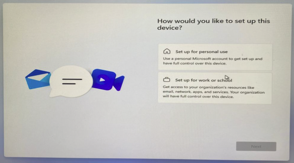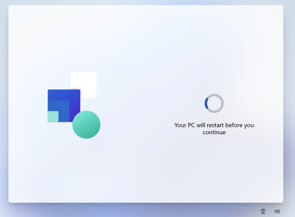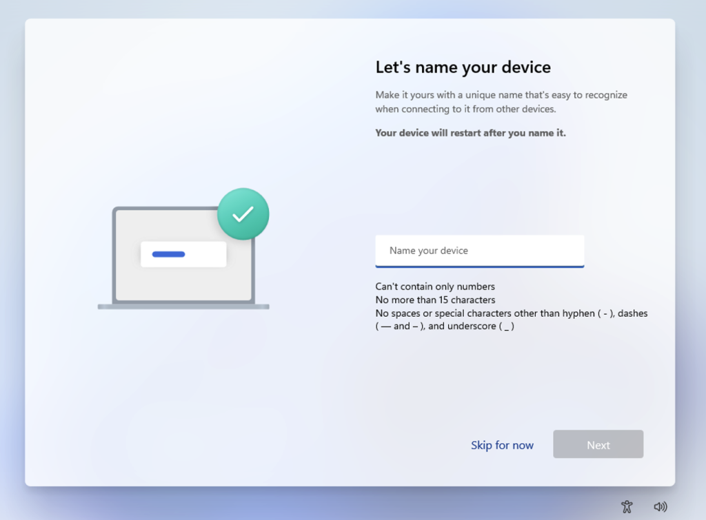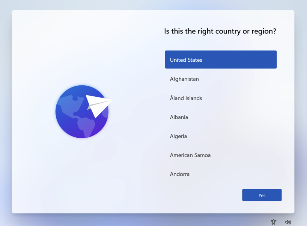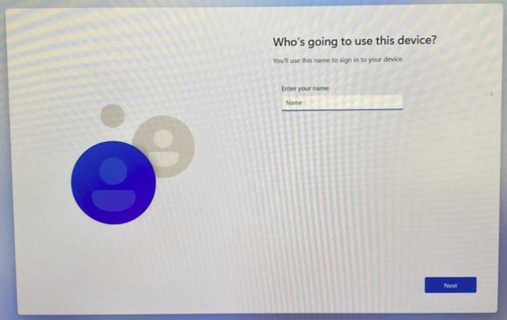 - Once the system rebooted and finished the installation, follow the Out-of-Box Experience (OOBE). In this phase you will be settings up: