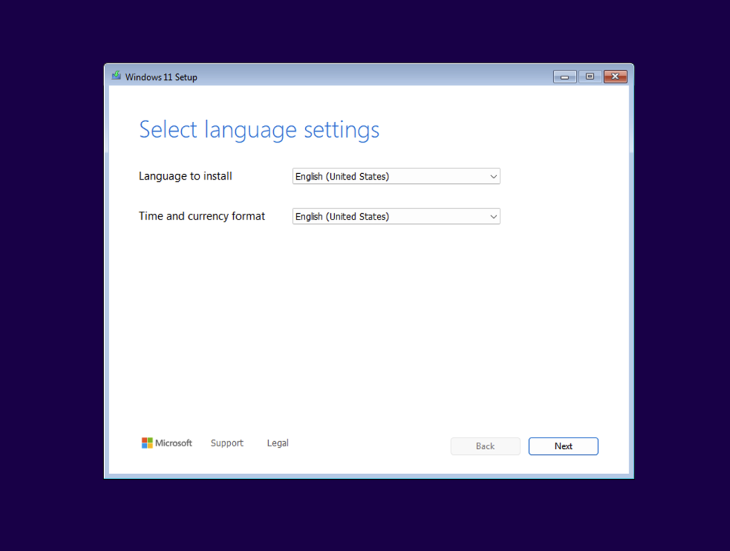 Please note that in this article we are using: Windows 11 24H2. - Select Language and Time as you wish and click Next.