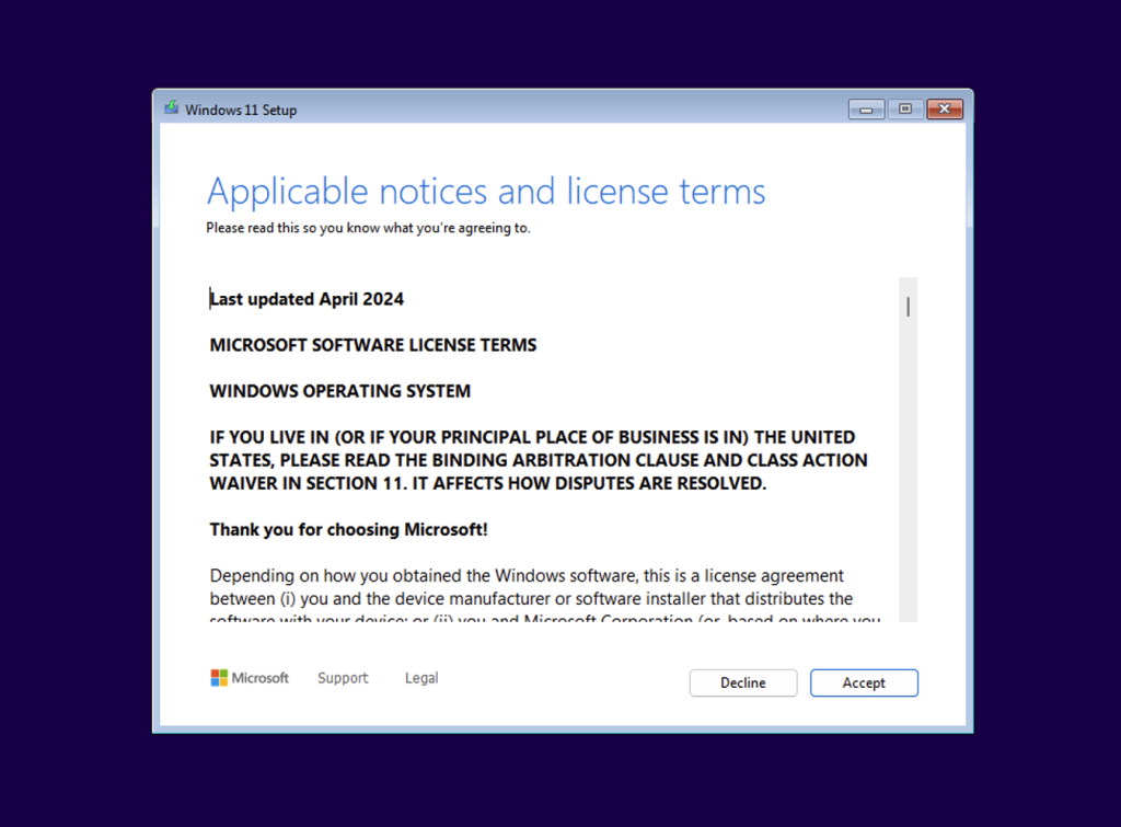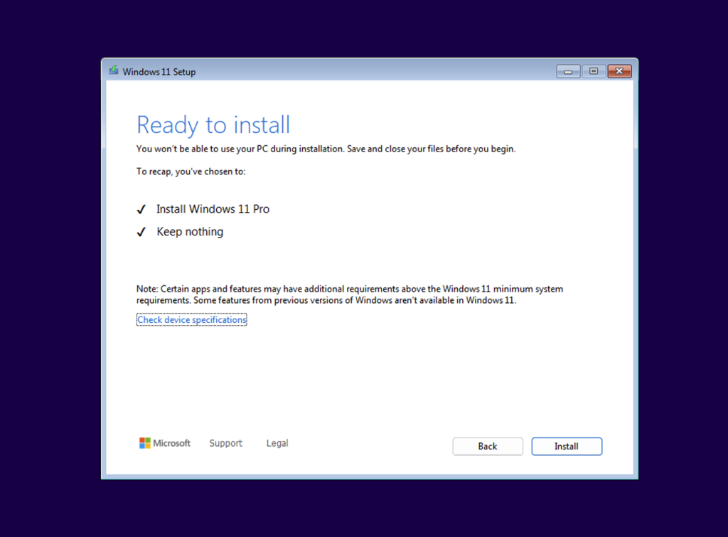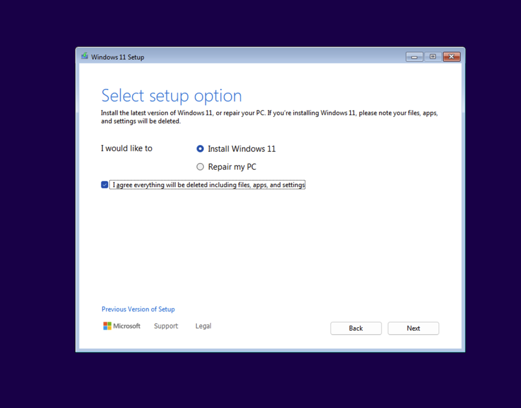 - Tick on ‘Install Windows 11’ and ‘I agree everything will be deleted including files, apps, and settings.