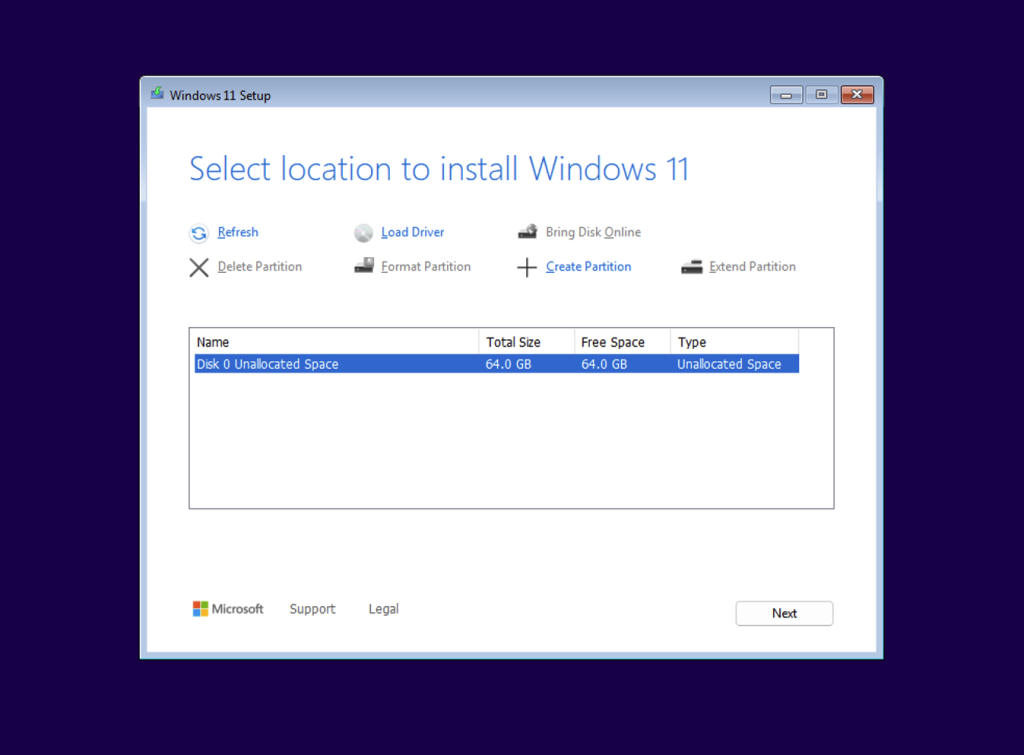 – Select the drive where you want to install Windows.- Delete existing partitions (if reimaging completely).